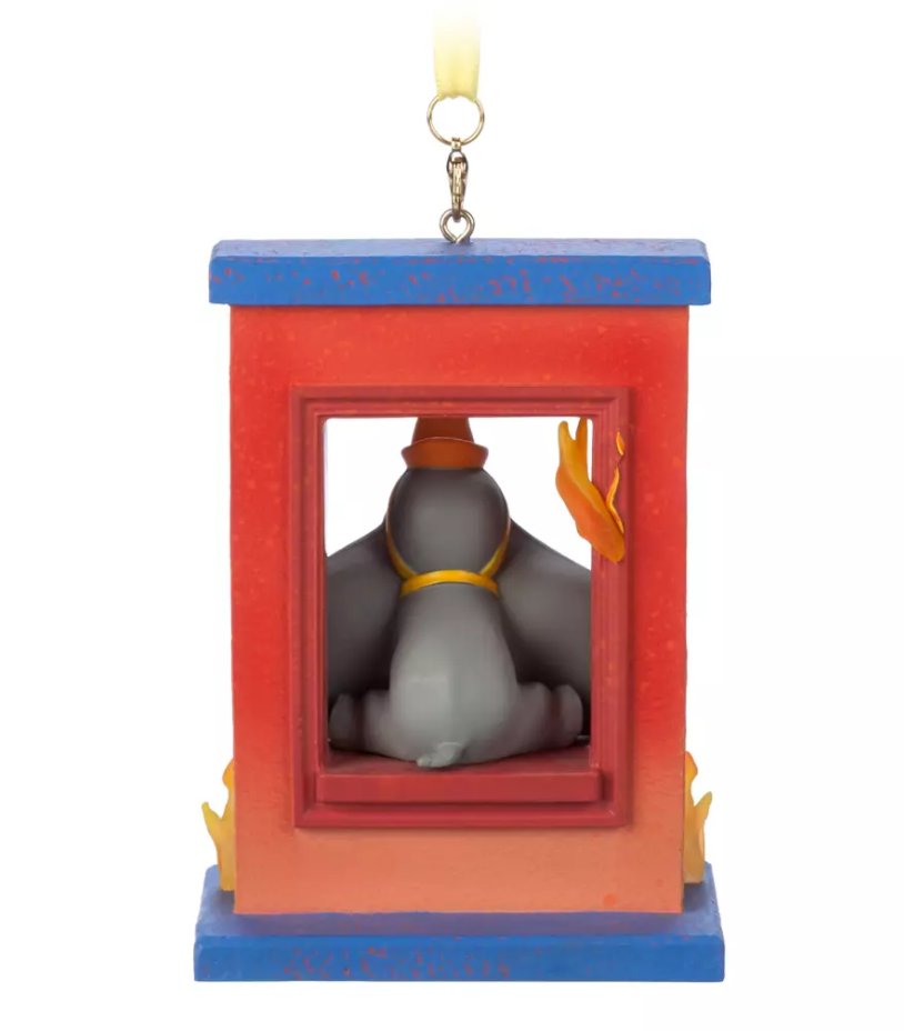 May we direct your attention high in the holiday tree where Dumbo is poised to dive in a daring circus stunt. The baby elephant with oversize ears, in clown makeup and surrounded by flames, will soon prove his worth as an adorable ornament!