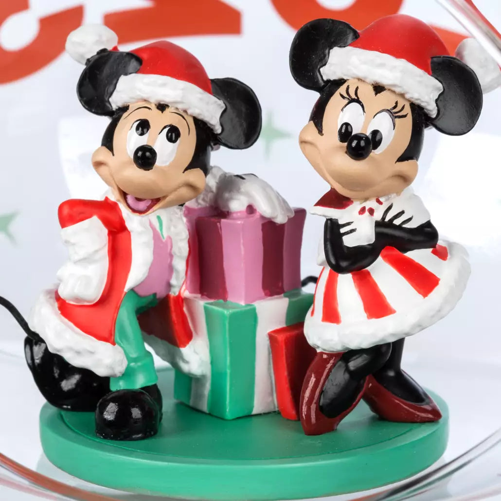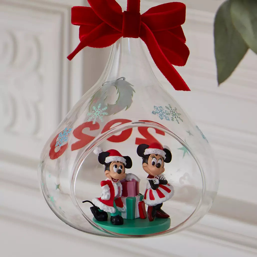 This gleaming glass droplet ornament features colourful snowflake accents and a cut-out window to view the tiny sculpture of Mickey and Minnie. Dated 2023, it's sure to make a memorable addition to your decor.